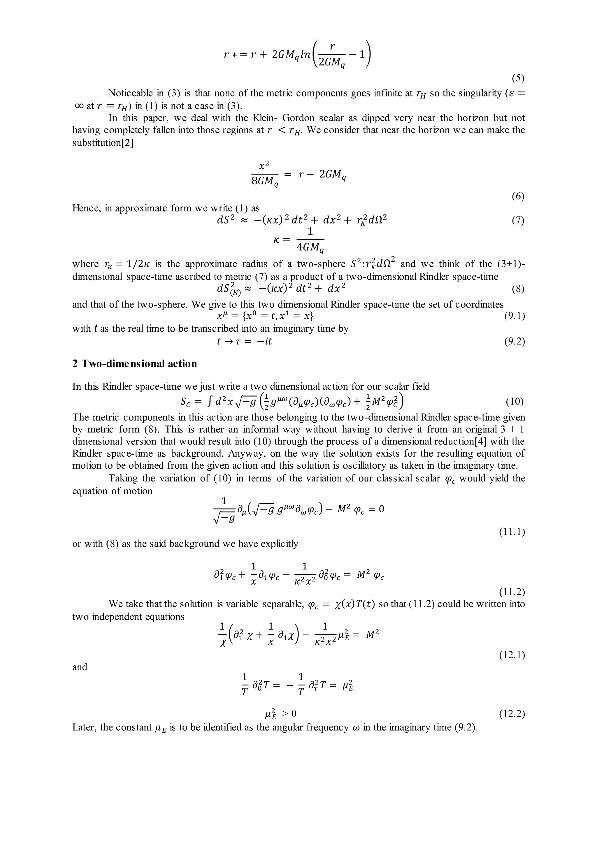 2) It defines a two-dimensional action for the scalar field and obtains from it the Klein-Gordon equation of motion in the Rindler space-time.
