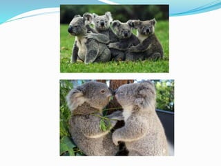 Koalas live in eucalyptus trees in Australia, where they sleep up to 20 hours per day. They weigh between 4-14 kg depending on age and eat eucalyptus leaves, bark, and fruit. Koalas are nocturnal and solitary mammals threatened by habitat loss as humans cut down trees. There are currently only an estimated 2,000-8,000 koalas left in the world.