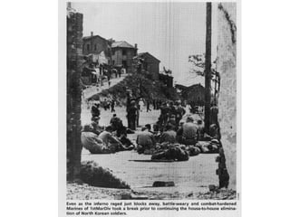 3) Fighting continued until 1953 when an armistice was signed, dividing Korea along the 38th parallel border and establishing a demilitarized zone. Over 2 million military and civilians were killed during the conflict.