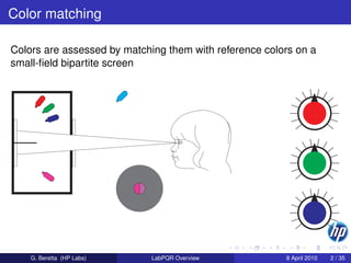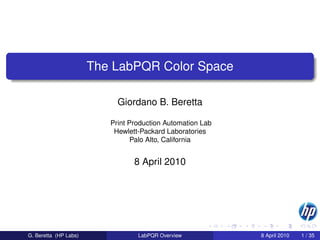 The document summarizes the LabPQR color space model proposed by researchers at Rochester Institute of Technology. The model uses a transformation from tristimulus values and a set of basis vectors derived from principal component analysis to represent color spectra in a lower dimensional space. This representation allows spectral data to be compressed while maintaining accuracy for applications like multi-spectral color reproduction. The model builds on prior work using matrix algebra to decompose color stimuli into fundamental and residue components.