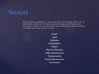 The Lahore Project is a citizens' initiative aimed at urban conservation and sustainable development in Lahore, focusing on identity, environment, and historical awareness. It promotes a symbiotic relationship between the city and its region, proposing urban strategies to address environmental and social challenges while emphasizing the need for community engagement and informed debate. The project outlines tasks such as developing regional strategies, enhancing social services, and promoting green spaces within the urban framework.