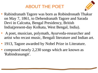 Rabindranath Tagore was a renowned Bengali poet, musician, and artist who won the 1913 Nobel Prize in Literature. The poem "The Last Bargain" describes the poet seeking employment from different people but finding their offers lacking until a child offers to hire him with nothing, making him a free man. In four stanzas, the king offers to hire the poet with power, a rich man with money, a fair maid with a smile, but it is a child playing on the beach who recognizes the poet and hires him with nothing, granting him true freedom.