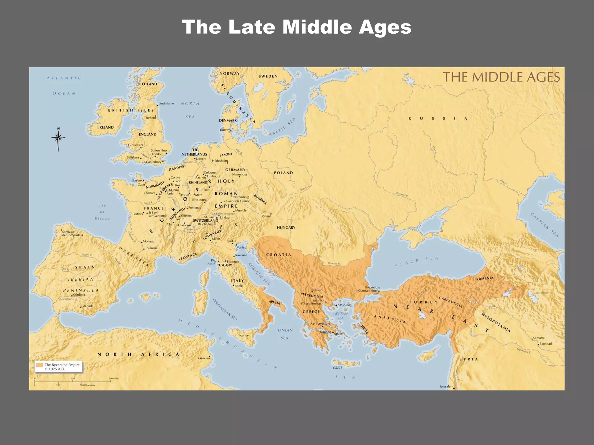 The document provides images and descriptions of important works of art, architecture, and manuscripts from the Late Middle Ages in Europe between the 8th-12th centuries. Key examples include illuminated gospel books commissioned by Charlemagne in the early 9th century, bronze doors from a German abbey church from 1015 depicting biblical scenes, and the growing popularity of pilgrimages to sites like Santiago de Compostela evidenced by its grand cathedral built in the 12th century.