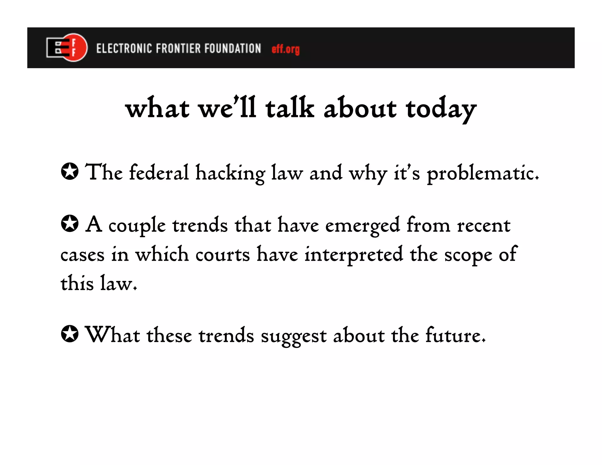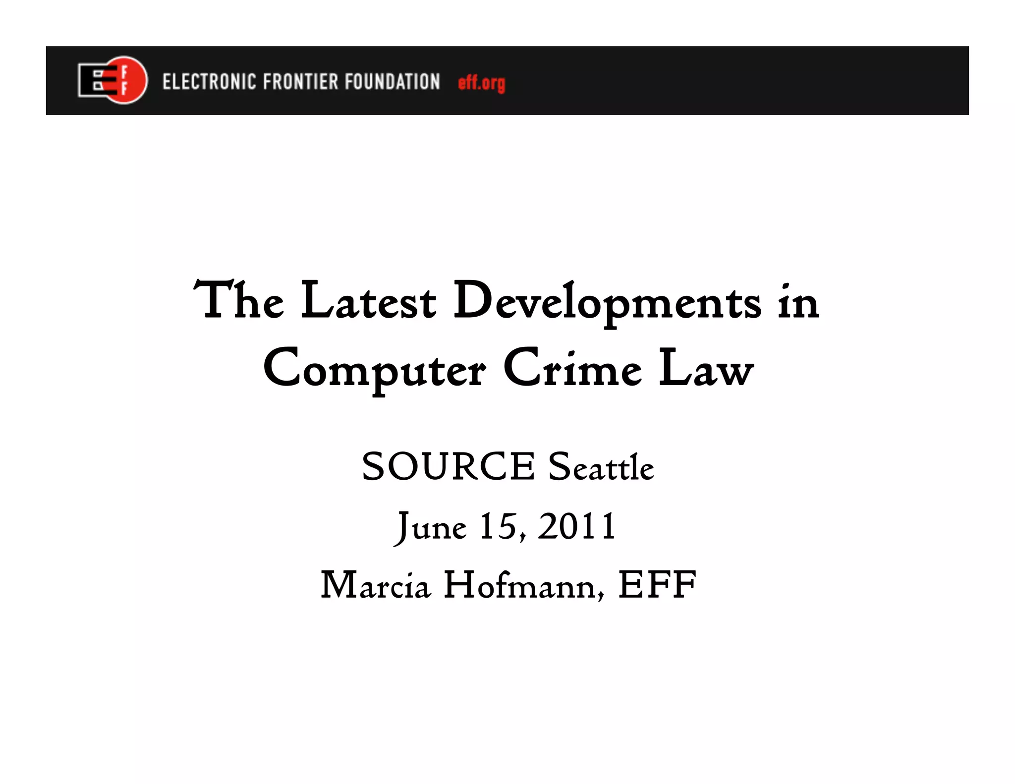 The document summarizes recent developments in computer crime law, specifically regarding interpretations of the federal Computer Fraud and Abuse Act. It discusses how courts have broadly interpreted what constitutes unauthorized access, including violating an employer's computer use policies. It also notes problems with prosecutors trying to double-count penalties for unauthorized access by charging it as a felony in furtherance of another crime when it is essentially the same conduct. The future could see legislative changes enhancing penalties for computer crimes.