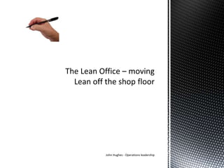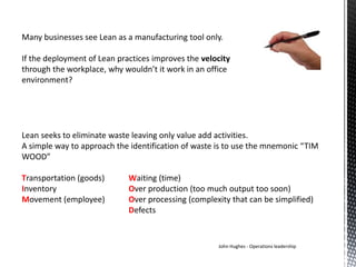 Lean principles can be applied to office environments to eliminate waste. The mnemonic "TIM WOOD" identifies common types of waste: transportation, inventory, movement, waiting, overproduction, overprocessing, and defects. Examples of waste in offices include unnecessary retrieval or storage of paperwork, open projects or unread emails, excess searching for files, waiting for responses, creating unnecessary reports, and data entry errors. Simple changes like organizing a desk efficiently, programming keyboard shortcuts, clearly labeling file cabinets, and managing electronic data can help reduce office waste.