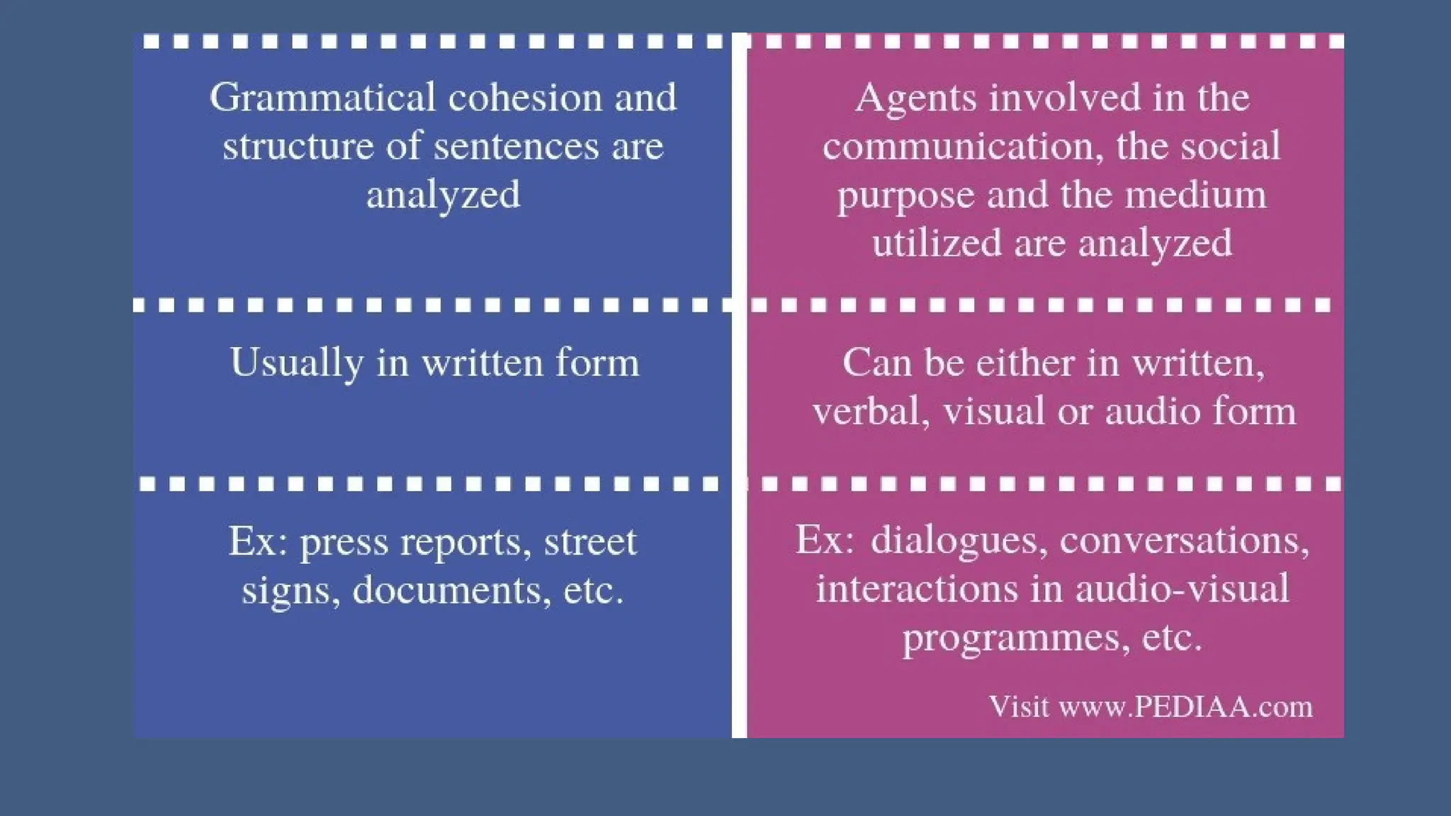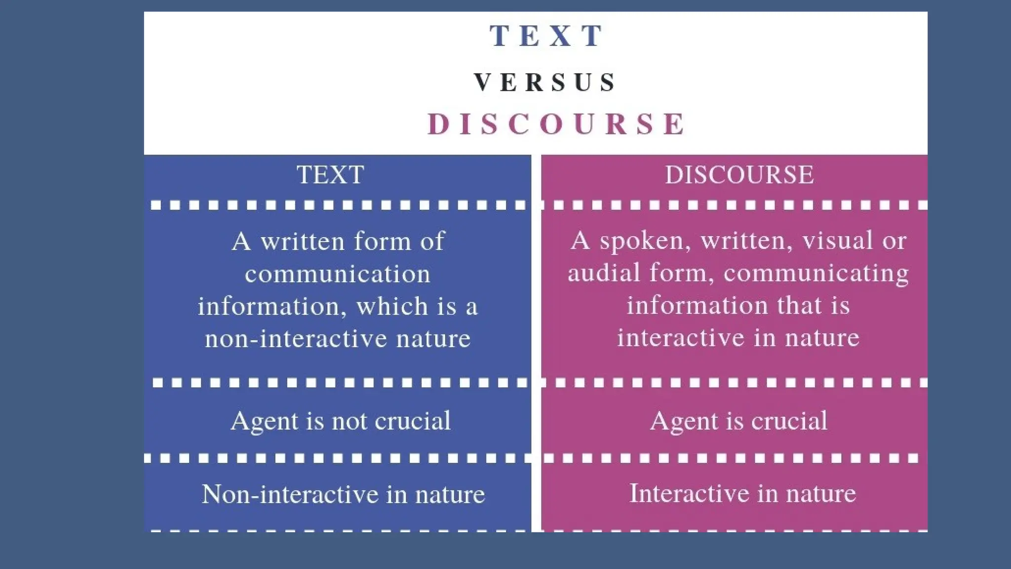 The document discusses the concept of discourse analysis, differentiating between text and discourse while exploring various types of discourse, such as argumentation, description, exposition, and narration. It emphasizes the importance of context, culture, and social environment in shaping a writer's perspective and highlights the necessity of coherence and cohesion for constructing well-written texts. Additionally, it provides examples, mistakes to avoid, and activities to reinforce understanding of these concepts.