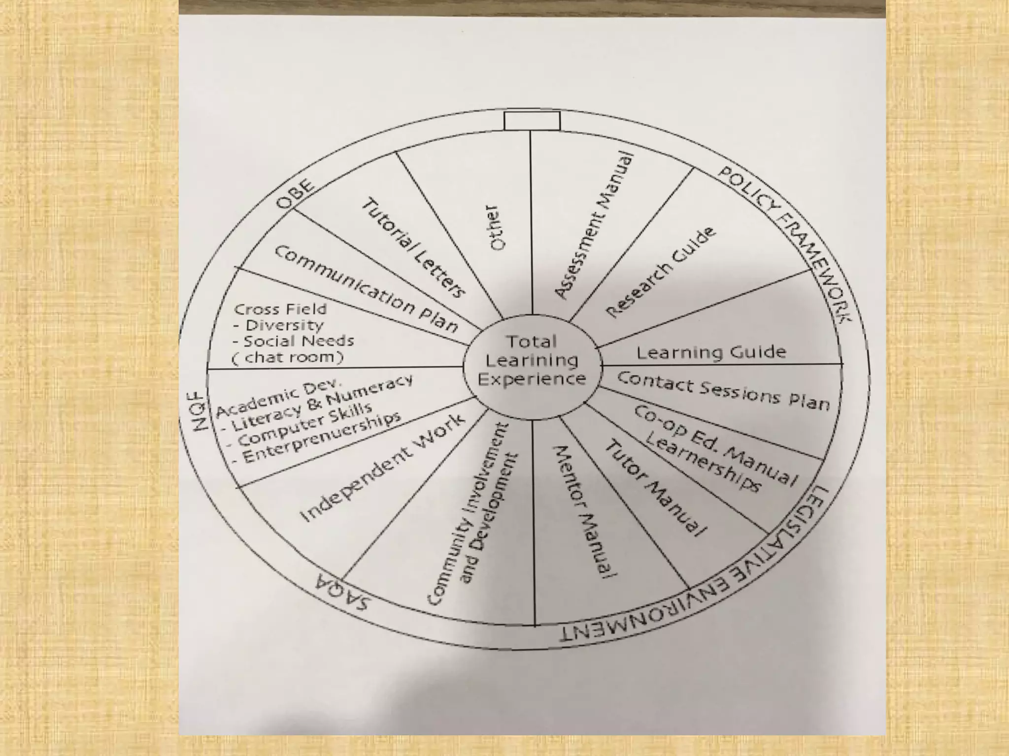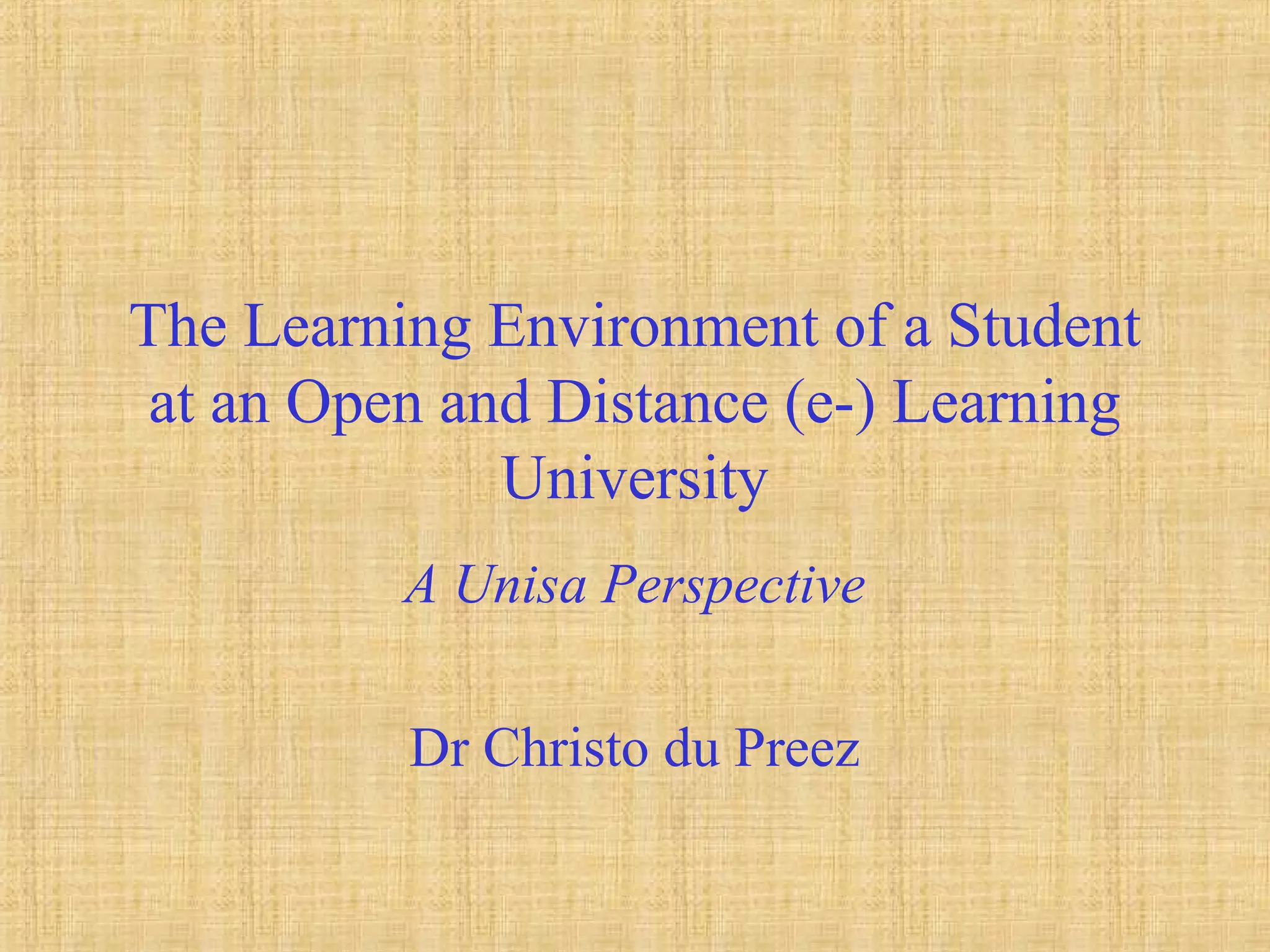 The document discusses the learning environment of students at an open and distance learning university from the perspective of Unisa. It presents a model of the total learning experience that incorporates various elements like learning guides, assessment, research, contact sessions, tutoring, mentors, community involvement, independent work, academic development, communication and diversity programs, and tutorial letters. The learning experience is impacted by changes, applying skills to changing circumstances, and multi-cultural environments.