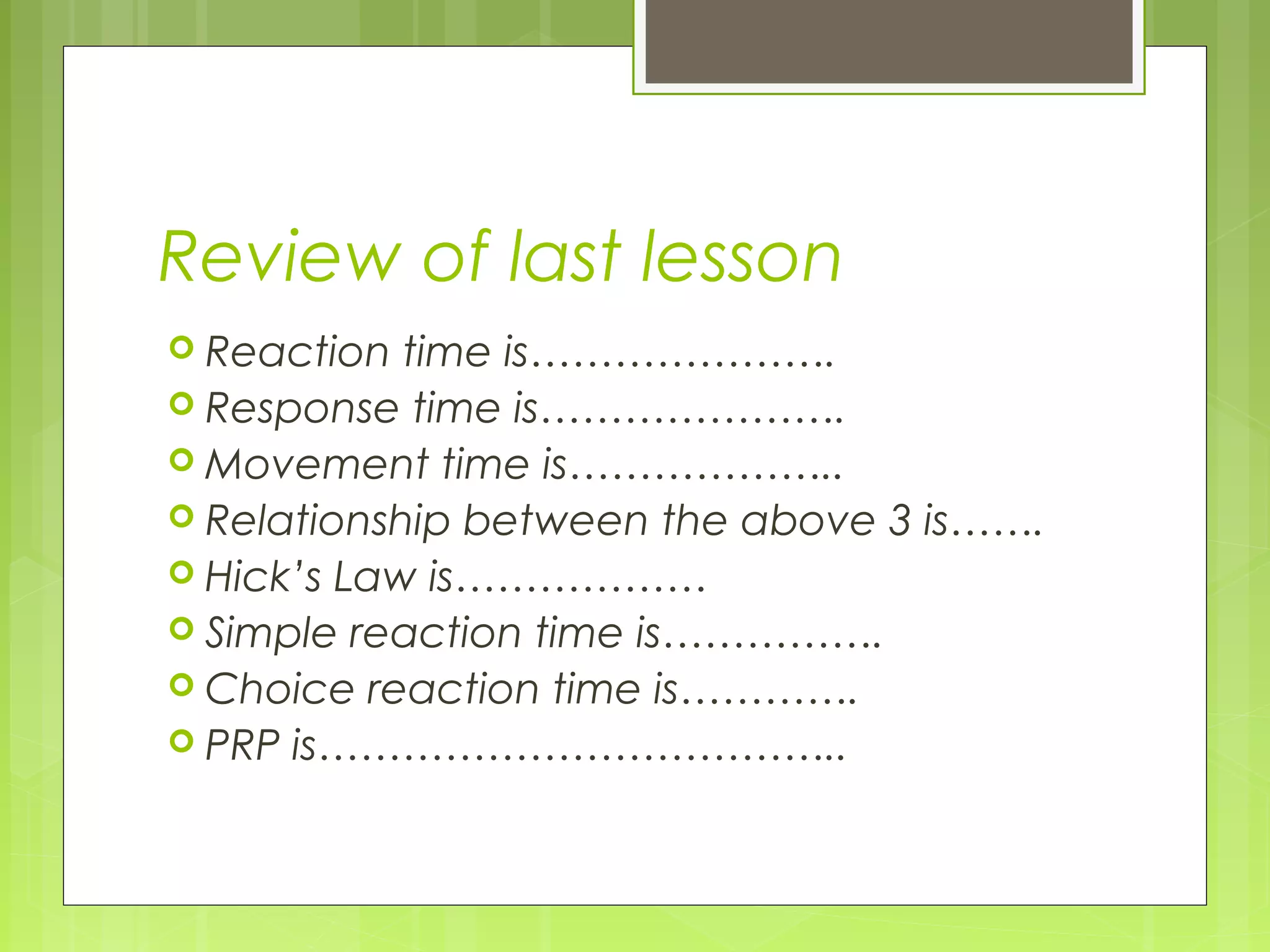 The document reviews key terms related to reaction time such as movement time, response time, and choice vs simple reaction time. It also discusses Hick's Law and the psychological refractory period. Sample exam questions are provided related to analyzing the stages of a racing start in swimming and identifying whether it is an example of simple or choice reaction time.