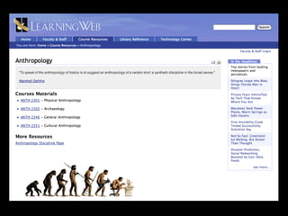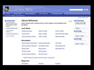 The Learning Web is an open-source instructional website using the Plone content management system, enabling faculty and staff to share content and engage in online instruction across five Houston Community College colleges. It emphasizes ease of use, community participation, and the use of open standards while offering various web tools like blogs and wikis. Ongoing support and training are provided to enhance the user experience and foster collaboration among faculty and students.