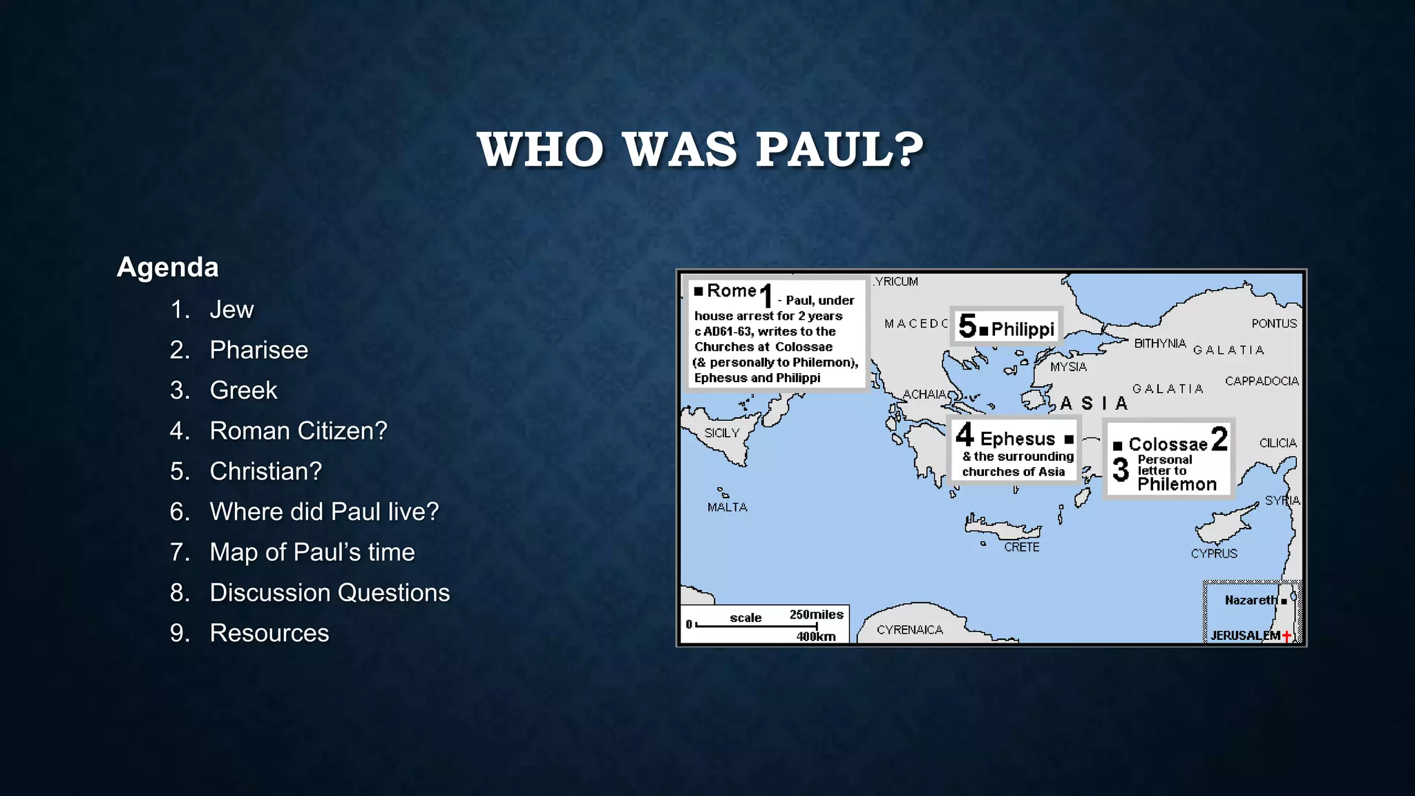 This document provides an introduction to the life and background of Paul. It summarizes that Paul was born in Tarsus in the 1st century CE to Jewish parents. He was educated in the Greek tradition and spoke Greek, Aramaic, and Hebrew. Paul was originally a Pharisee but had a conversion experience on the road to Damascus where he became a Christian. The rest of his life he spent traveling throughout the Roman Empire spreading the message of Christianity, although he always identified himself as a Jew. The document provides a map of the areas Paul traveled and lists additional resources to learn more about Paul.