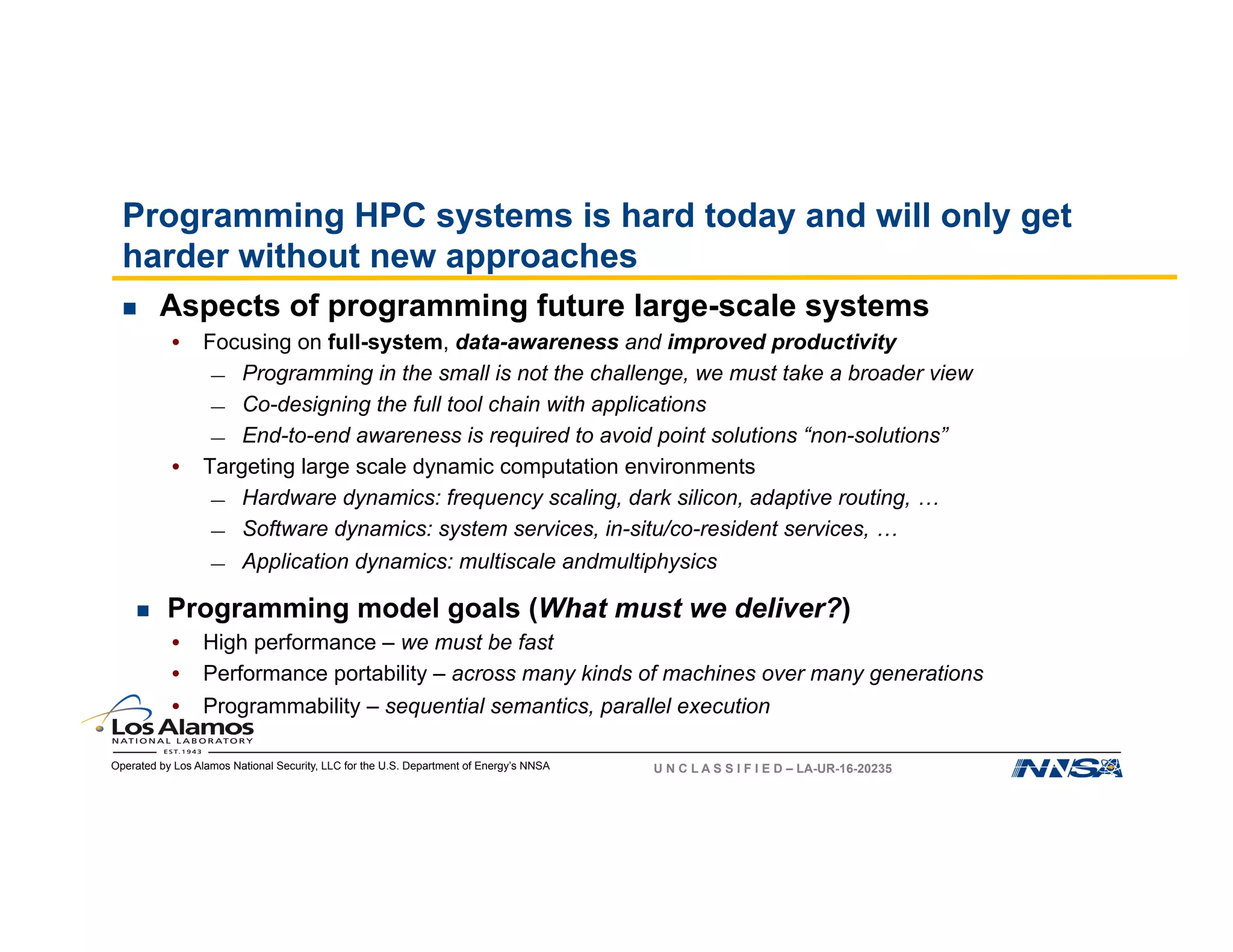 The document discusses the challenges of programming large-scale high-performance computing (HPC) systems and introduces the Legion programming model as a solution. It emphasizes the need for performance portability, programmability, and high performance, while detailing the structure and benefits of Legion's approach to managing complexity in dynamic environments. Key features of Legion include asynchronous execution, task dependency management, and a focus on data model and mapping optimizations that enhance performance and facilitate scientific advances.