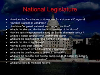 - Congress is bicameral, consisting of the House of Representatives and Senate