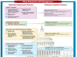- Congress has enumerated powers listed in the Constitution as well as implied powers, and it shares foreign relations and war powers with the President