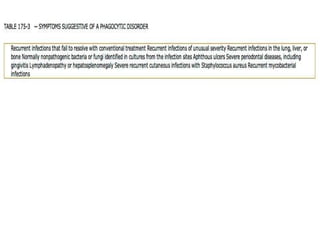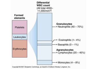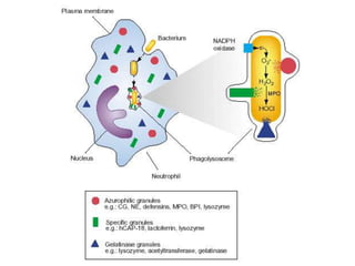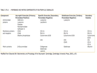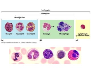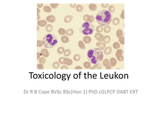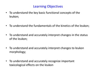 This document discusses the toxicology of leukocytes, including their components, functions, and toxic effects. It covers the kinetics, morphology, and interpretation of changes to neutrophils, eosinophils, basophils, monocytes, and lymphocytes. Important topics include mechanisms of neutrophilic leukocytosis, idiosyncratic toxic neutropenia, phagocyte function, the eosinophilia-myalgia syndrome, and causes of changes in the different leukocyte types.