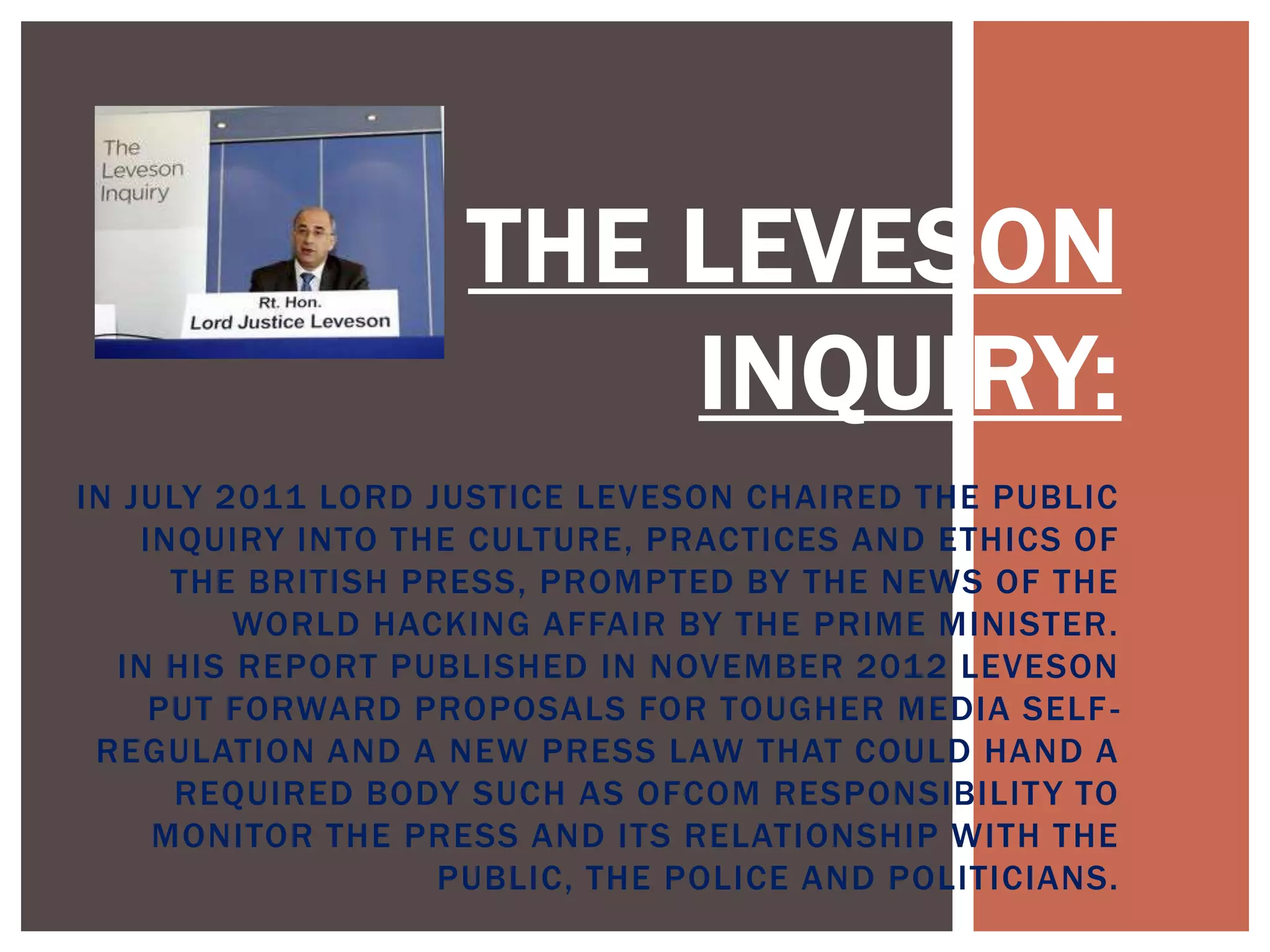 The Leveson Inquiry was a public inquiry into the British press established in 2011 and led by Lord Justice Leveson. It examined the relationship between the press, police and politicians in the wake of the phone hacking scandal at News of the World. In his 2012 report, Lord Justice Leveson proposed a new independent press regulator backed by legislation to monitor newspapers and ensure ethics, while maintaining press freedom. He recommended tougher self-regulation with powers like fines for ethics violations.