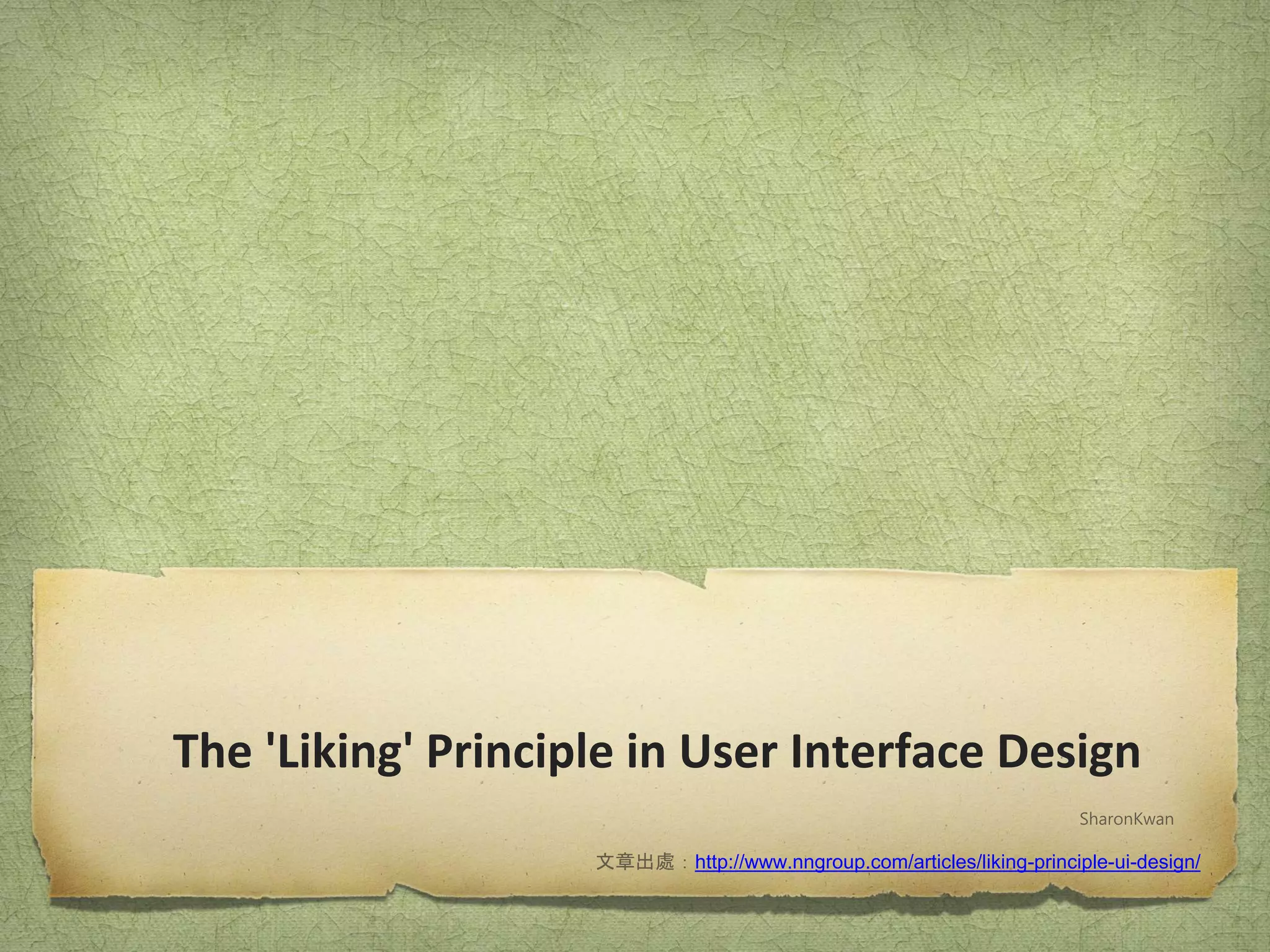 该文档探讨了用户界面设计中的'喜爱原则',强调人们倾向于喜欢与自己相似或熟悉的事物。该原则源于罗伯特·西奥迪尼的研究,指出通过展示真实人物和共鸣价值观可以增强用户的亲切感。成功应用此原则需深入了解用户行为并进行可用性测试。