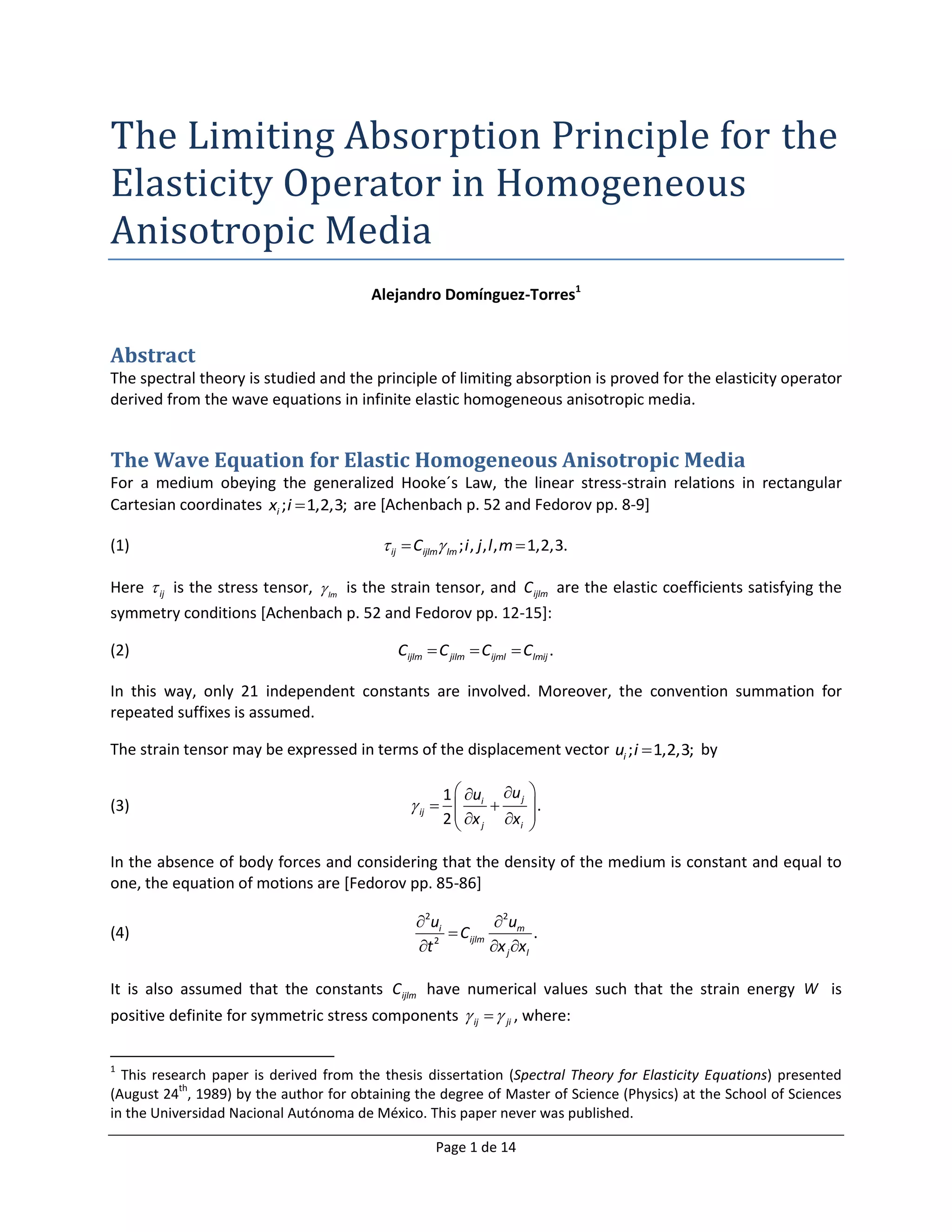 The document summarizes the spectral theory and principle of limiting absorption for the elasticity operator in infinite, homogeneous, anisotropic media. It defines the elasticity operator and establishes its properties, including that it is self-adjoint. It derives the wave equation for elastic media from Hooke's law and the equations of motion. It shows plane wave solutions to the wave equation and establishes Christoffel's equation.