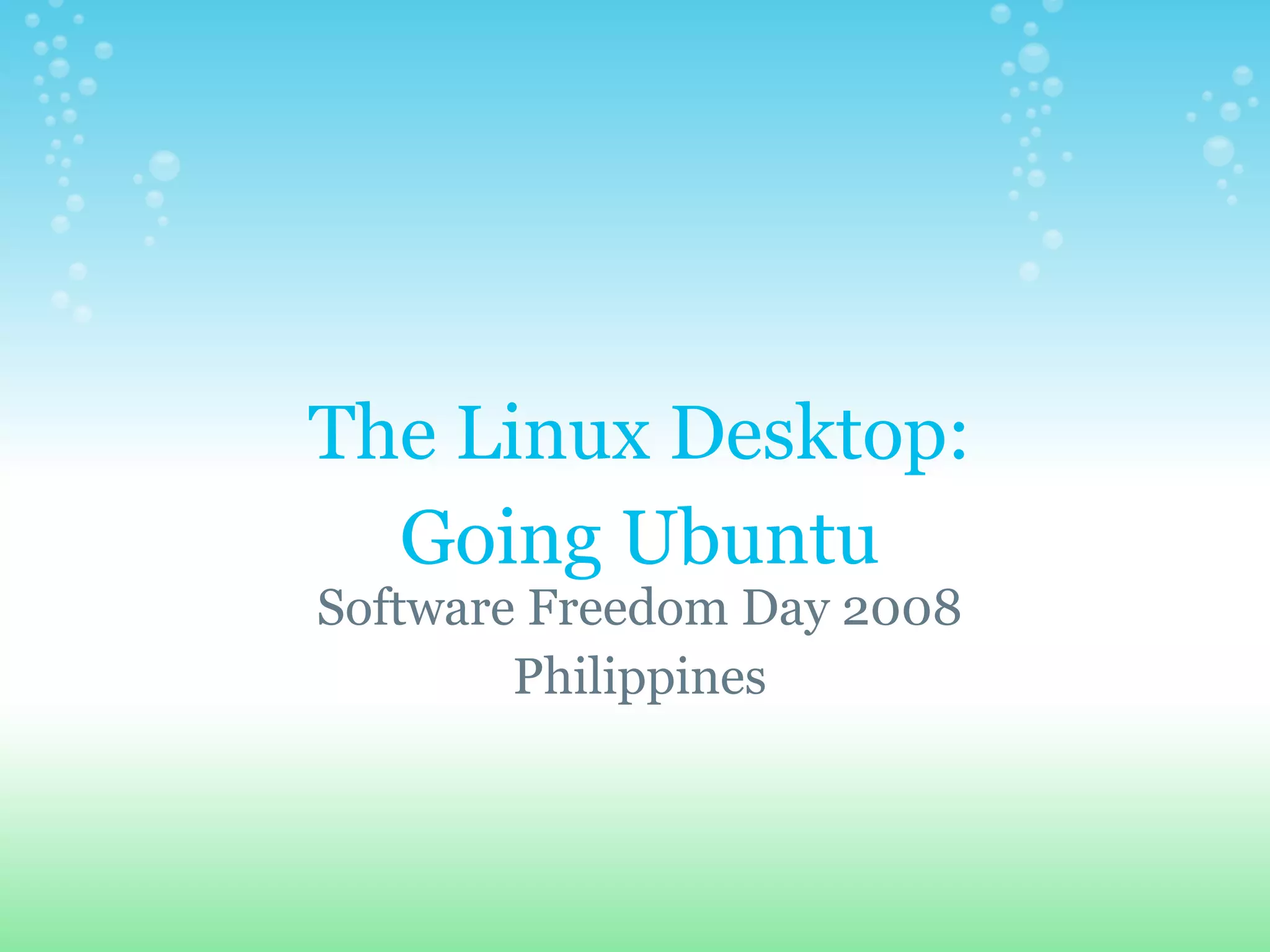 Ubuntu is a free and open-source Linux operating system that provides software for music, internet surfing, documents and more without viruses. It includes applications like Rhythmbox for music playback, Firefox for web browsing, Pidgin and Kopete for messaging, and OpenOffice for word processing, spreadsheets, presentations and databases in an open standard format. Ubuntu offers these capabilities to users while respecting their freedom and sharing through its community-driven development.