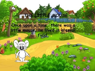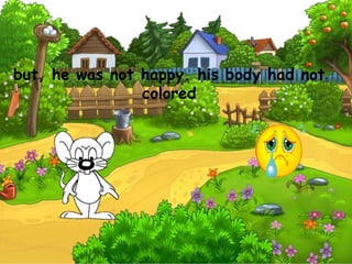 The little mouse was unhappy that his body was not colored like the other mice. He asked the fairy to give him different colors, requesting his body to be purple, his legs red, his arms pink, his face peach, his ears yellow, and his tail green. The fairy granted all of his requests, and the little mouse was very happy with his colorful new appearance.