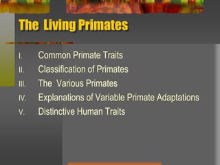 This document discusses primates and their traits. It covers common primate characteristics like fur, warm-bloodedness, and social learning. It also describes the classification of primates into prosimians, monkeys, apes, and humans. Specific details are provided on locomotion, diet, senses, brain size, habitats, and behaviors of different primate groups. The document concludes by outlining distinct human physical and behavioral adaptations, including tool use, language, hunting, bipedalism, extended childhood, and gender roles.