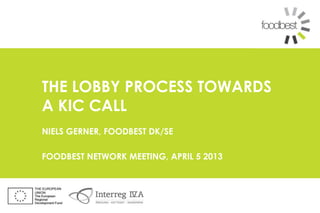 The document discusses strategies for lobbying towards a future Knowledge and Innovation Community (KIC) call on food by the European Institute of Innovation and Technology (EIT). It outlines engaging EU institutions, existing KICs, and primary stakeholders to build the strongest food KIC candidacy. Key actions include prioritizing areas of business opportunities with core partners in Denmark and Sweden and strengthening entrepreneurship and education programs.