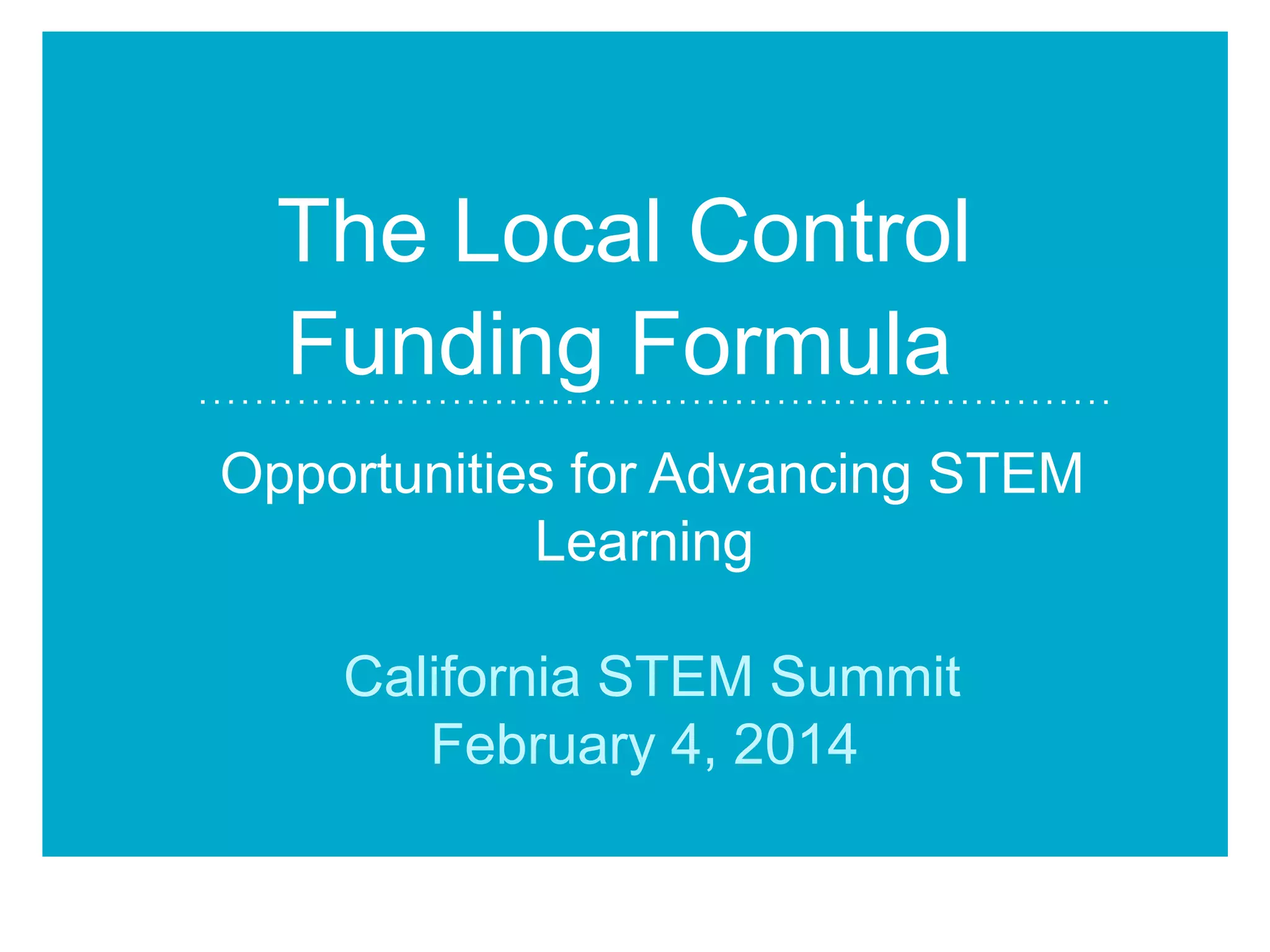 This document provides an overview of the Local Control Funding Formula (LCFF) in California. It explains that LCFF aims to give more local control over funding by providing a base grant amount to districts plus supplemental funding for low-income students, English learners, and foster youth. It outlines the accountability process where districts must adopt a 3-year Local Control and Accountability Plan (LCAP) with input from parents and community to outline goals and expenditures. The document encourages districts to engage stakeholders early in the planning process and leverage LCFF to advance STEM goals that close achievement gaps.