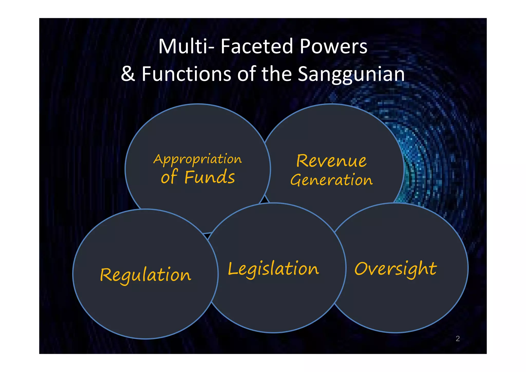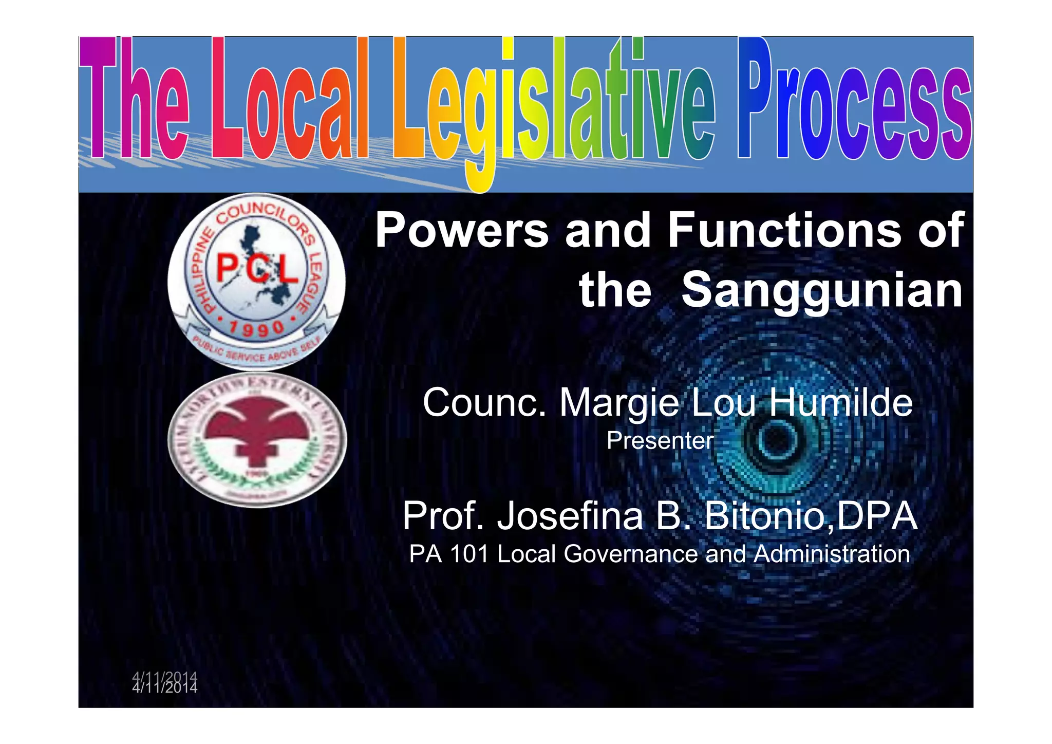 The document discusses the powers and functions of local legislative bodies called Sanggunians in the Philippines according to the Local Government Code. It outlines that Sanggunians have multi-faceted powers including legislation, regulation, revenue generation, and oversight. Some key powers and functions mentioned are enacting ordinances, approving the local budget, reviewing policies and programs of the local executive branch, and ensuring compliance with legislative intent. The document also discusses concepts like quorum, veto powers, effectivity of ordinances, and areas the Sanggunian can regulate and legislate.