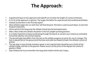 The document discusses the key aspects of the long jump, including the approach, takeoff, and landing. It explains that a gradual acceleration during a 12-19 stride approach is important to build up speed. The takeoff requires planting the foot flat to create vertical lift and propel the athlete forward. Efficient techniques like the hitch-kick and hang are used in the air to maximize distance by counteracting rotation before landing and bending the knees to absorb the impact.