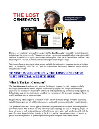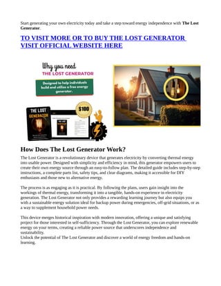 Discover a revolutionary approach to energy with The Lost Generator, inspired by historic ingenuity and designed for modern needs. This generator allows you to create sustainable electricity using readily available materials and straightforward, easy-to-follow plans. Ideal for DIY enthusiasts, it offers a cost-effective power solution, especially useful for emergencies or off-grid setups.