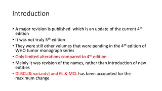The 2016 revision of the WHO classification of lymphoid neoplasms made several important changes compared to the previous 2008 classification. For chronic lymphocytic leukemia/small lymphocytic lymphoma, it clarified the concept of monoclonal B-cell lymphocytosis as a precursor lesion. For follicular lymphoma, it introduced the terminology of pediatric-type follicular lymphoma and duodenal-type follicular lymphoma. For mantle cell lymphoma, it described the role of SOX11 overexpression and identified CCND2 translocations in cyclin D1-negative cases. It also provided updates for other lymphomas such as diffuse large B-cell lymphoma.