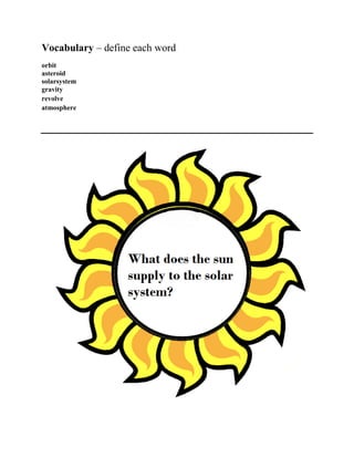 The document contains a series of questions related to space topics, including vocabulary words like orbit, asteroid, and solar system. It covers inquiries about celestial bodies such as the sun, comets, Saturn, Uranus, and Pluto. Additionally, it prompts for specific facts such as the first man on the moon and the composition of various planets.