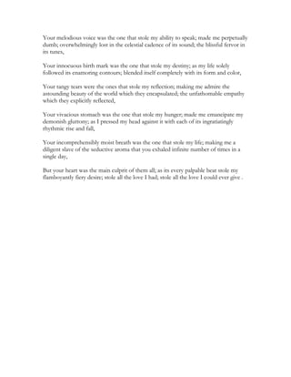 The speaker describes how every part of their lover's body has stolen something from them, rendering them helpless and enamored. Their eyes stole sight, lips stole taste, hands stole strength, hair stole senses, nails stole ability to scratch, feet stole stride, teeth stole laughter, skin stole blood, voice stole ability to speak, birthmark stole destiny, tears stole reflection, stomach stole hunger, and breath stole life. Ultimately, it is their lover's heart that is the "main culprit" as its beats stole the speaker's desire and ability to love.