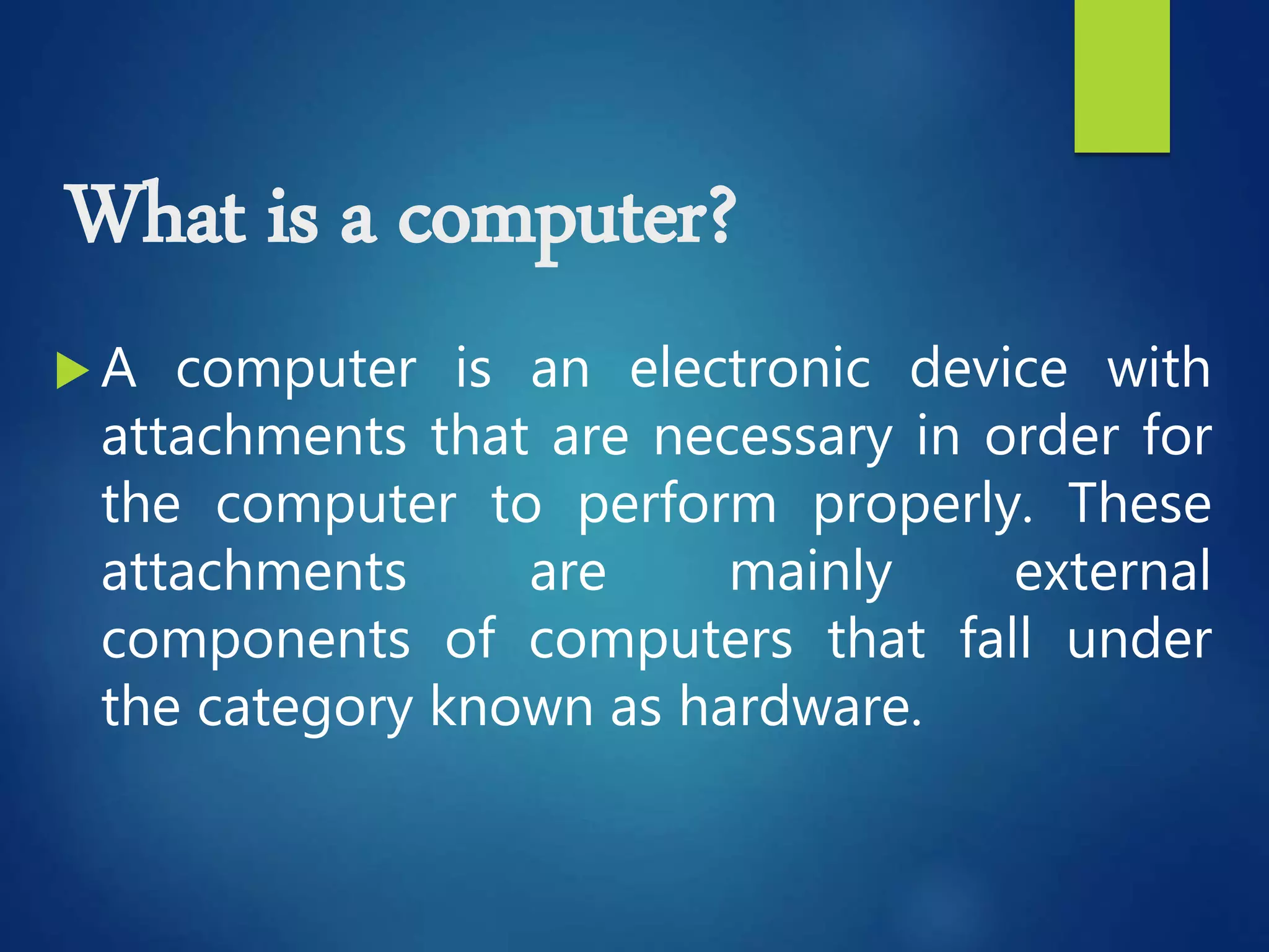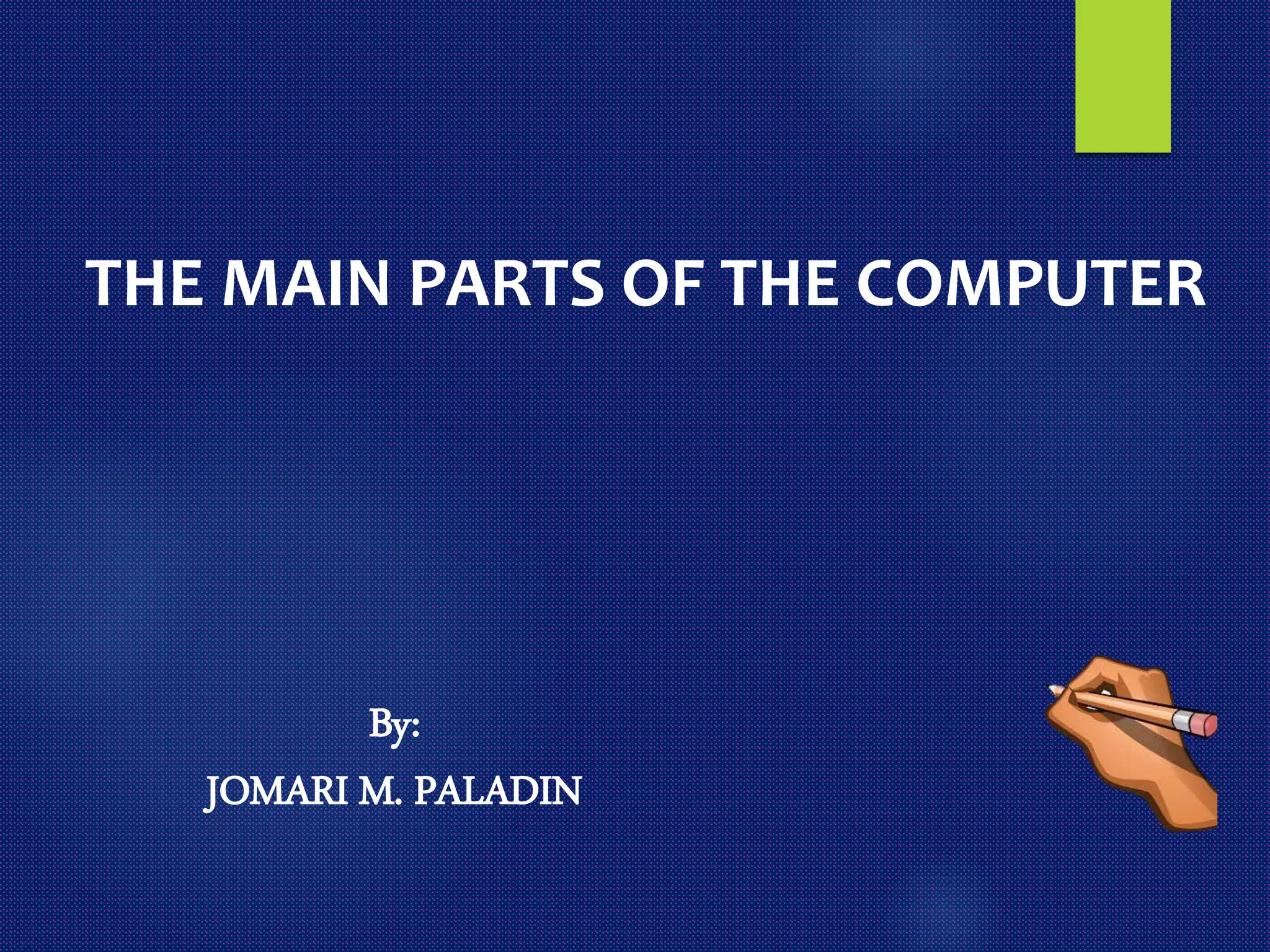 The main parts of a computer include the mouse, keyboard, monitor, speakers, system unit, printer, compact disks, and thumb drives. The mouse and keyboard are used for input, while the monitor displays output. The system unit contains the central processing unit and motherboard that act as the computer's brain. External storage devices like compact disks and thumb drives allow transferring and storing files.