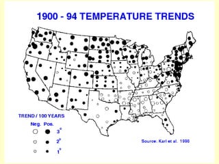 The document discusses the structure of the atmosphere and the greenhouse effect, detailing how greenhouse gases like carbon dioxide, methane, and nitrous oxide absorb infrared radiation and contribute to global warming. It explains the sources of these gases and their impact on climate, as well as the redistribution of energy from low to high latitudes. Additionally, it highlights the distinction between climate variability and climate change.