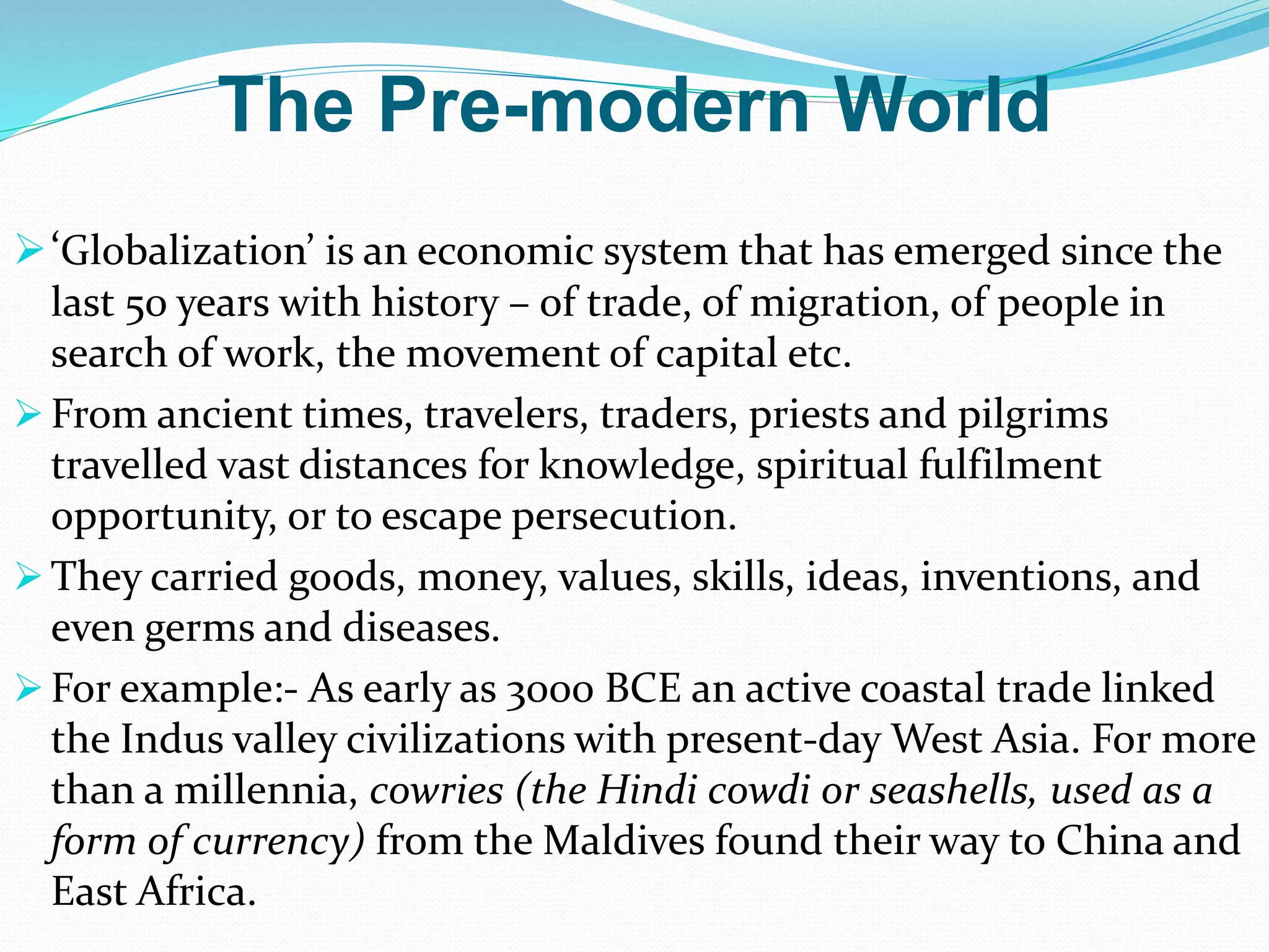 The document discusses the evolution of globalization from ancient trade and migration patterns to the complex economic systems of the 19th century, highlighting key historical events such as the Silk Routes and the impact of colonialism. It details how food, technology, and labor flows transformed economies and societies globally while contributing to both prosperity and exploitation. Specific historical examples, such as the Irish Potato Famine and the indentured labor system, illustrate the diverse experiences of peoples affected by these global changes.