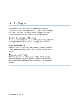 The document discusses how management systems used by organizations today are based on principles from over a century ago that are no longer well-suited to the modern business environment. It argues exponential change, hypercompetition, and global knowledge sharing have created new challenges. The century-old focus on top-down control hampers organizations from adapting quickly enough. A new management approach is needed that can integrate information and realize changes to find insights in data through greater awareness.