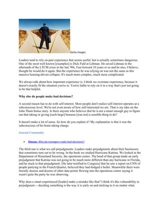 The document discusses reasons why smart and experienced leaders sometimes make bad decisions. It examines research in neuroscience and psychology to understand decision-making. Four main reasons are provided: 1) Overreliance on past experience that does not fit the current situation. 2) Unconscious self-interest that is not recognized. 3) Making prejudgments early on and sticking to them despite new information. 4) Attachments to people, places, or things that cloud objectivity. To reduce bad decisions, leaders must recognize their own biases, get different perspectives by bringing in opposing views, and have boards that engage in real debate rather than just agreeing.