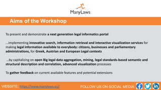The document summarizes a workshop on a next generation legal informatics portal called ManyLaws. The workshop aims to present and demonstrate ManyLaws' innovative search, information retrieval, and interactive visualization services for making legal information available to all. It will also gather feedback on current features and potential extensions. The agenda includes a presentation of ManyLaws, demonstrations of its portal under Greek and Austrian legal contexts, and a feedback collection session.