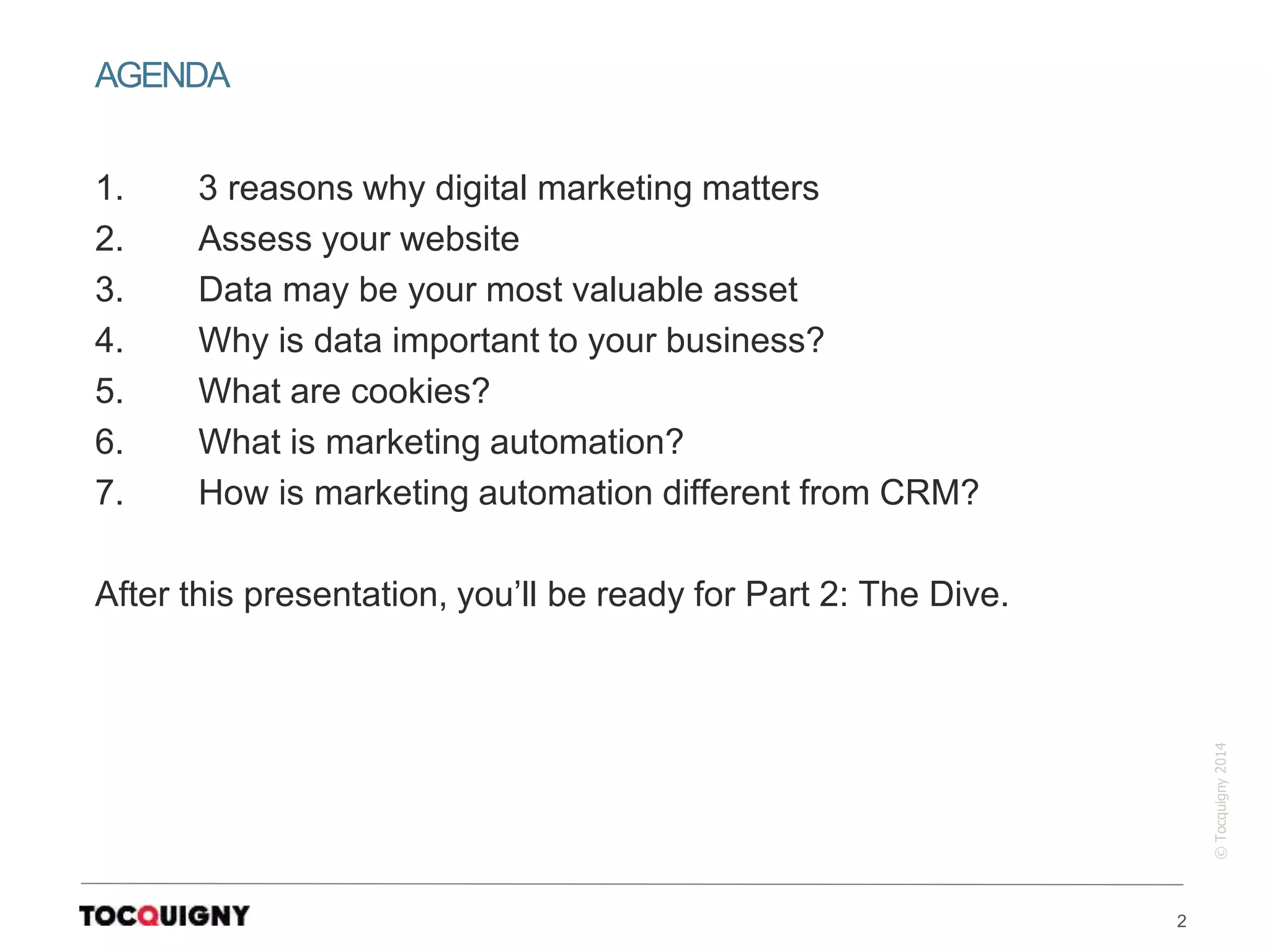 The document outlines the basics of marketing automation, emphasizing the importance of digital marketing, data assessment, and website optimization for business growth. It explains how marketing automation differs from CRM and highlights the significance of high-quality data in achieving better sales outcomes. The agenda includes defining marketing automation, assessing website effectiveness, and understanding data hygiene and integration challenges.