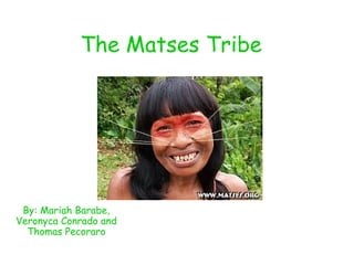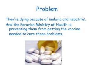 The Matses Tribe is an indigenous group living in the Amazon Rainforest along the Javari River basin in Peru. They are dying from malaria and hepatitis but the Peruvian Ministry of Health is preventing them from receiving needed vaccines. The Matses refuse to be controlled by outsiders and only allow their own people to guide outsiders. They have a mix of animist and Christian religious beliefs and practices. The proposed solutions are to start a car wash or grocery store fundraiser to raise money to buy medicine for the Matses people.