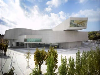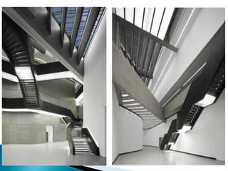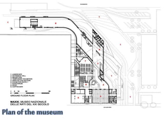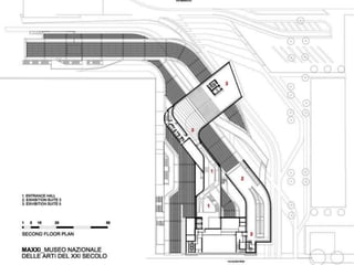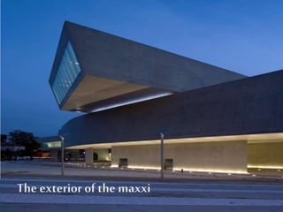 The MAXXI Museum in Rome, Italy was designed by renowned Iraqi-British architect Zaha Hadid. Completed in 2009, it features two museums for art and architecture across 27,000 square meters. The fluid building has no rigid separation between interior and exterior spaces, with intersecting walls that create both indoor and outdoor galleries lit by a glass roof. It helped establish Hadid's pioneering style of parametricism through innovative design and expansion of formal concepts.