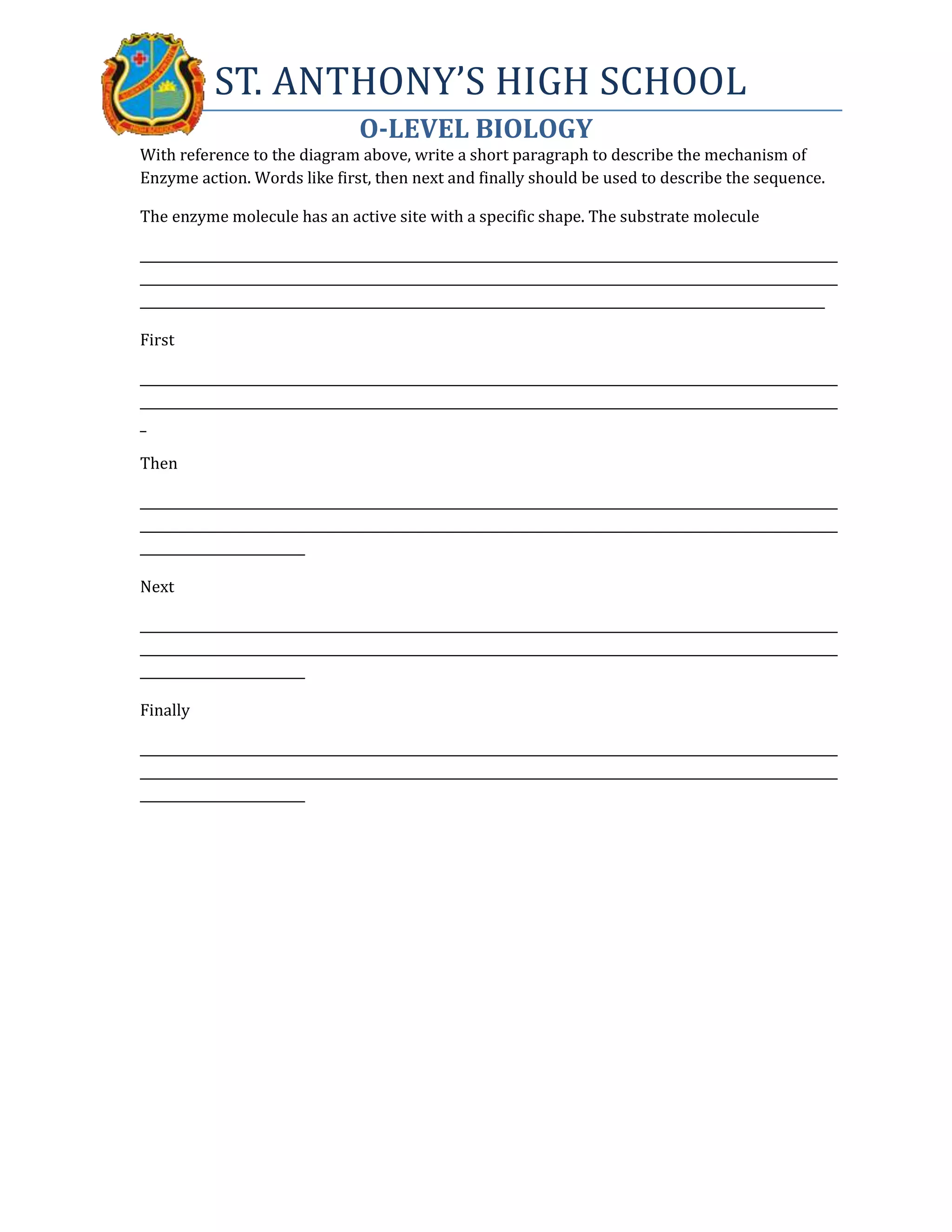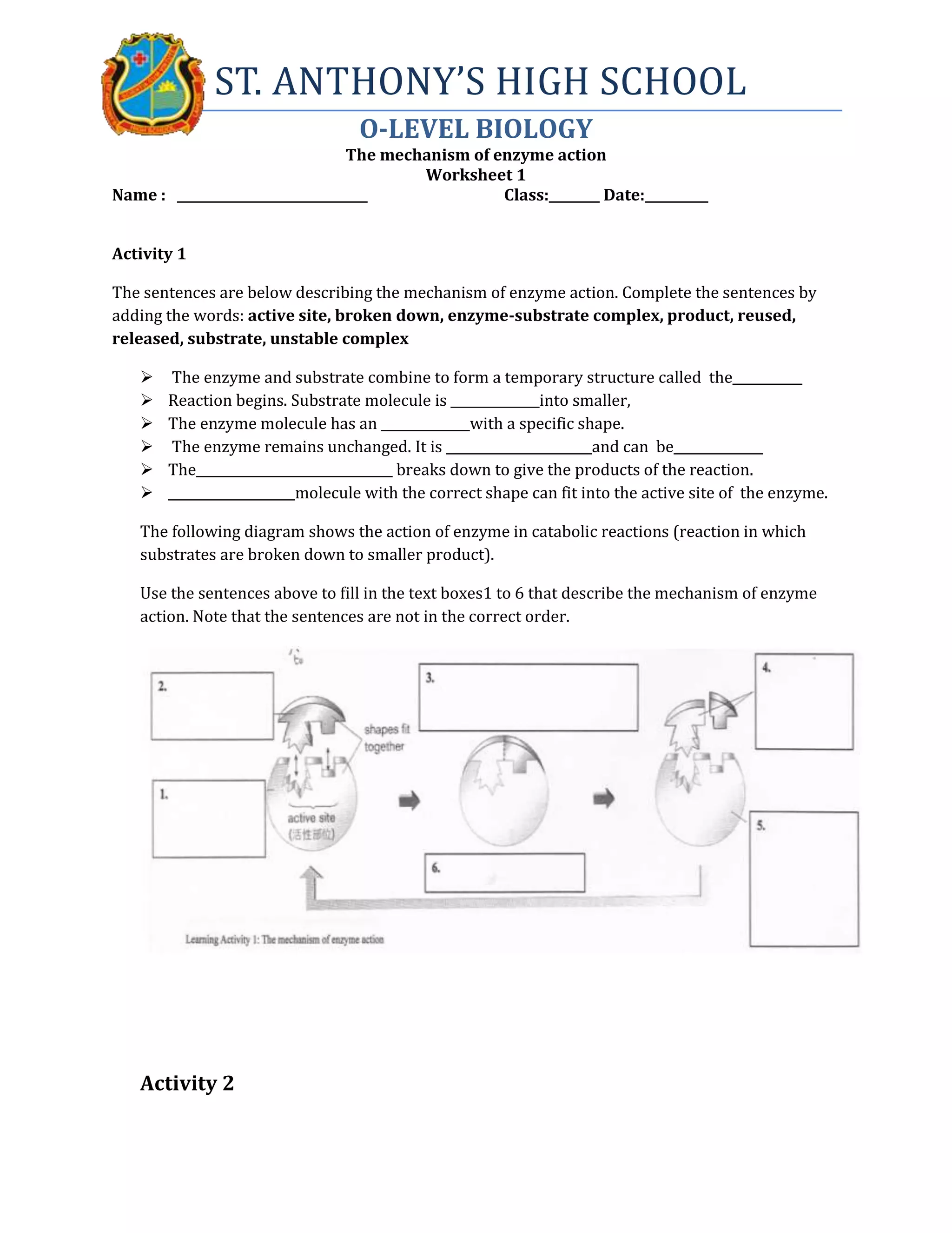 1) Students complete sentences describing the process. Enzymes form a complex with substrates, catalyze their breakdown into products, and are then released unchanged to catalyze more reactions.