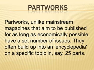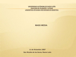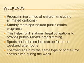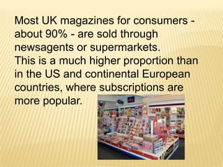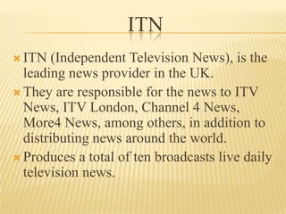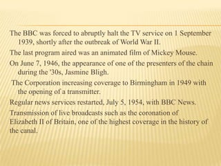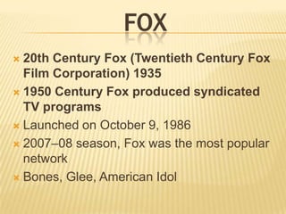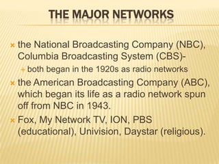 This document provides an overview of mass media and television in different countries. It discusses the history of mass media beginning in the 19th century with developments like the printing press and comics. It outlines the major forms of television delivery in the United States including broadcast, cable, satellite, and internet television. It also summarizes the history and programming of major US television networks like CBS, NBC, ABC, and Fox. The document then discusses television systems and programming in the UK, highlighting pioneers like John Logie Baird and the role of the BBC.