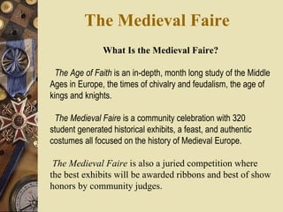 The Cascade Middle School Medieval Faire is a community celebration that highlights student-generated historical exhibits focused on the Middle Ages in Europe. This event involves a juried competition with awards for the best exhibits and features a feast, costumes, and significant engagement from parents and community members. Students undertake a comprehensive mastery project that includes research, multimedia presentations, and creative displays to showcase their understanding of medieval history.