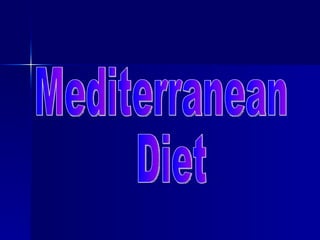 The document describes the key features of the Mediterranean diet, which includes high consumption of plant-based foods like fruits, vegetables, legumes, grains, and olive oil; moderate amounts of dairy, fish, poultry and eggs; small amounts of red meat; and regular physical activity. The Mediterranean diet emphasizes focusing on vegetables, whole grains, beans, nuts and olive oil as the primary sources of fat.