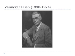 The document discusses Vannevar Bush's concept of the Memex, introduced in his seminal 1945 article 'As We May Think,' as a device for personal information storage and retrieval amidst growing information overload. Although it was never built due to its high cost and the technology of the time, the Memex significantly influenced future developments in hypertext, personal information systems, and other technologies. Its vision set the groundwork for innovations in human-machine interaction and information organization.