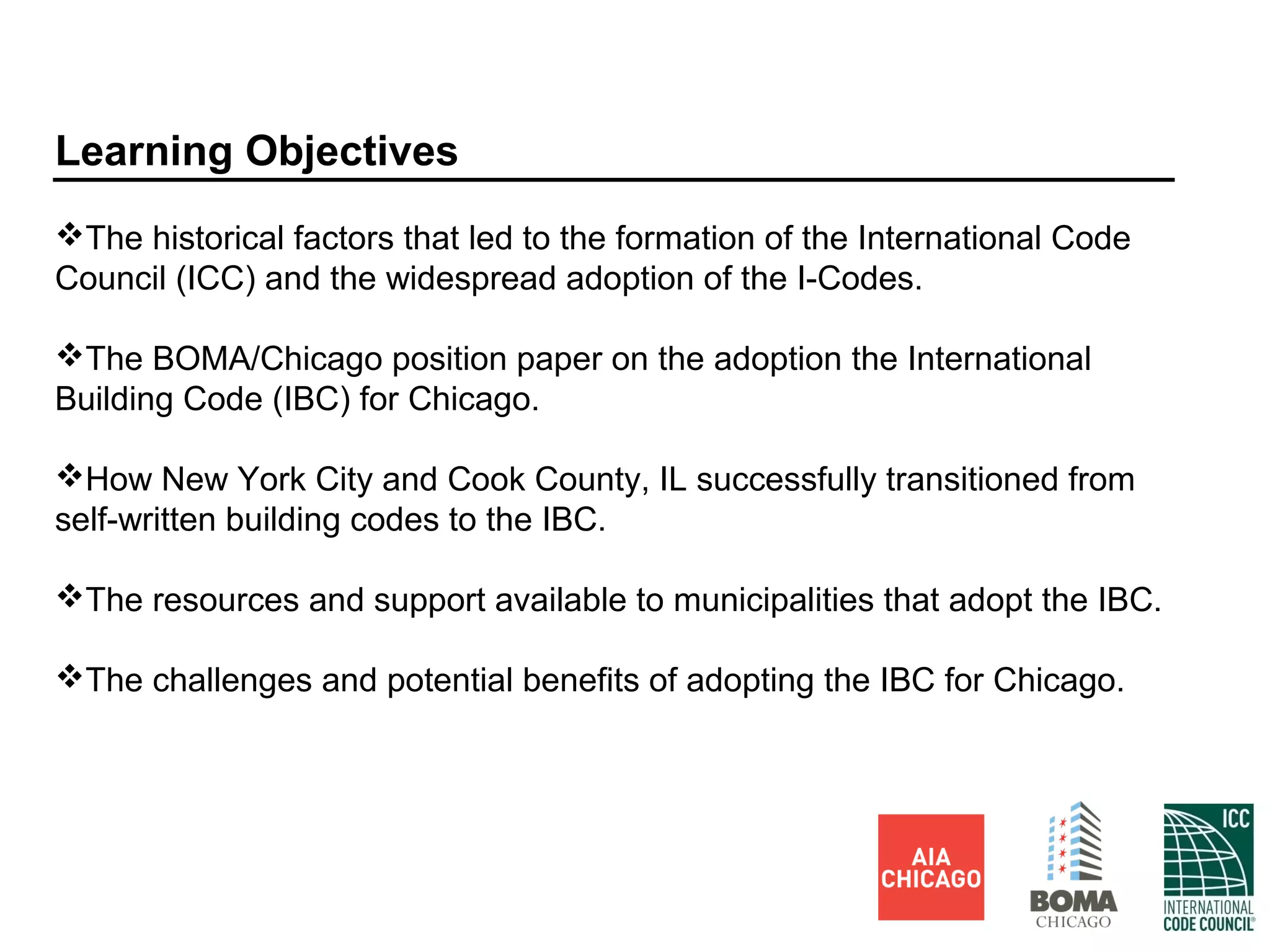 The document discusses a presentation on the merits of adopting the International Building Code (IBC) in Chicago. It provides background on the outdated nature of Chicago's current building code and incomplete past efforts to update it. It notes most major US cities have adopted ICC model codes like the IBC and outlines the presentation's learning objectives and agenda, including speakers from AIA Chicago, BOMA Chicago, Cook County, and the ICC to discuss reasons for adopting the IBC and examples from New York City and Cook County's adoption processes.