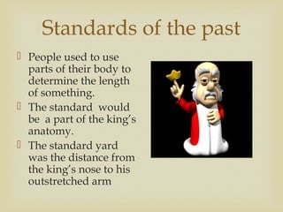 The document discusses measurement standards and the development of the metric system. It notes that early standards were based on body parts but were inconsistent. Scientists later developed the metric system using scientific measurements like the distance from the Earth's pole to equator to define standardized units like meters, liters and grams that are related by factors of 10. The metric system was created to provide an exact, uniform international standard to replace inconsistent English units and avoid mistakes caused by mixing measurement systems.