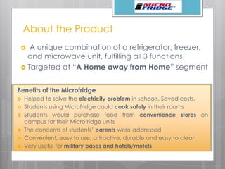 The document discusses the Microfridge product, which combines a refrigerator, freezer, and microwave. It is targeted at institutional living situations like colleges, military bases, and hotels/motels. The main markets in 1994 were colleges (55% of revenue), military (25%), and motels (18%). Microfridge faced medium competition but had patent protection. It acquired another company and replaced refrigerators with Microfridge units. While using two suppliers reduced costs, it created compatibility issues. Microfridge planned to focus on new "home away from home" products, rapidly increase sales, get $4M in equity, and repay debt to withstand future competition. Recommendations included innovating for new markets, focused product development, and exploring new