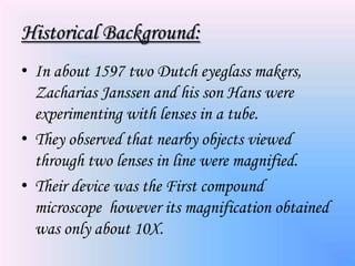The document discusses the history of the microscope and identifies the key parts and their functions, including the eyepiece, objective lenses, stage, light source, and how they work together to produce a virtual magnified image, with light from the condenser focusing on the specimen through the objectives and eyepiece. Images are formed when light from the object passes through the objective lens to form a real inverted intermediate image that the eyepiece further magnifies into a final virtual upright image for viewing.